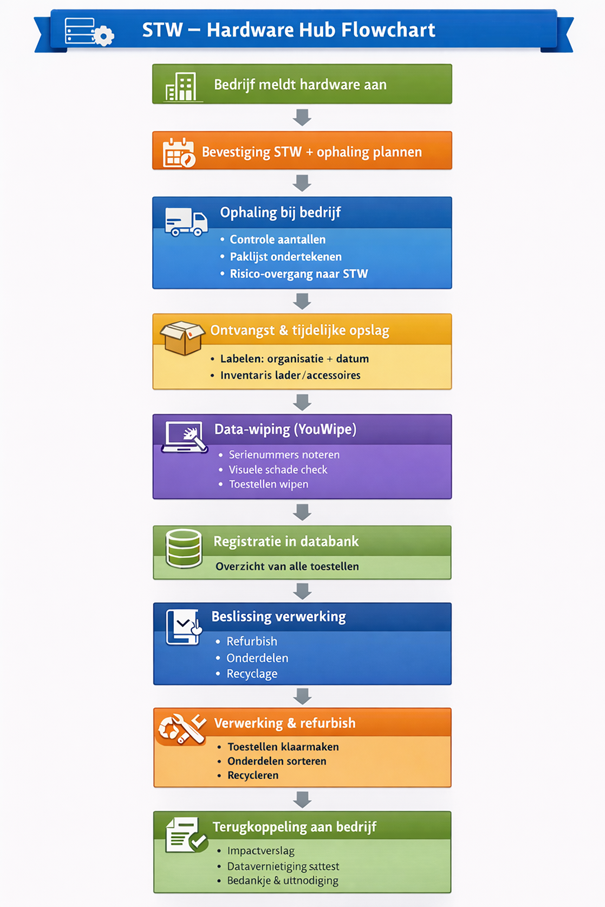 - STW heeft jarenlange ervaring in het veilig wissen en refurbishen van IT-materiaal, onder andere voor Zorgbedrijf Antwerpen, en bouwt met de Hardware Hub verder aan deze expertise voor heel Antwerpen.